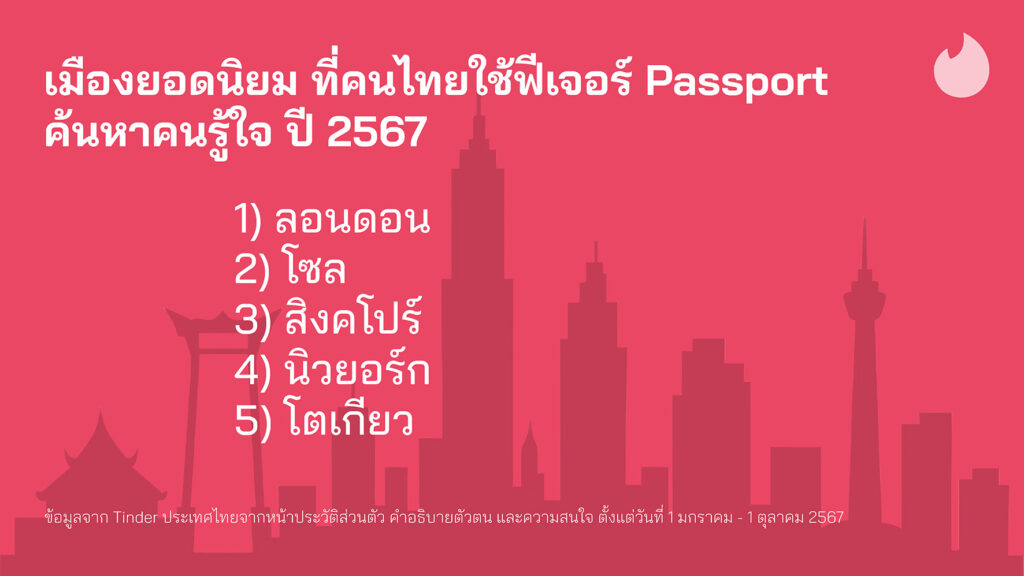 จากข้อมูลของ Tinder ระบุว่า⁴ เมืองยอดนิยม ที่คนไทยใช้ฟีเจอร์ Passport เดินทางค้นหาคนรู้ใจในปี 2567 ได้แก่ ลอนดอน โซล สิงคโปร์ นิวยอร์ก และโตเกียว ไม่ว่าจะเป็นการ “มองหา” ใครสักคนที่ลอนดอน หรือตามหารักแท้ที่โซล Gen Z ไทยก็พร้อมเปิดใจไปกับการเชื่อมต่อกับผู้คนทั่วมุมโลก